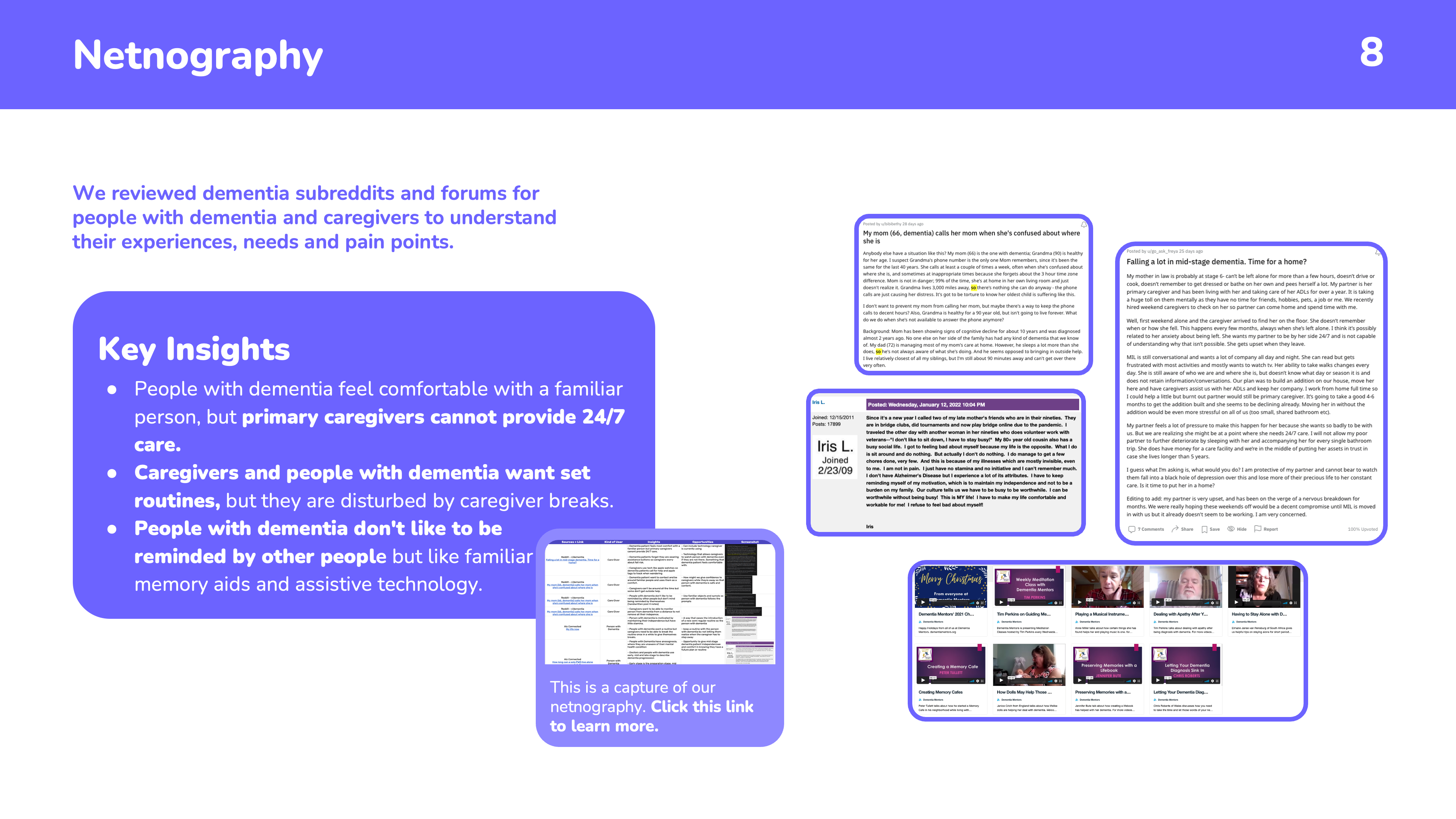 • Color Choice: We've selected shades of purple, a color widely associated with dementia awareness, to serve as comforting and familiar visual cues within the app.