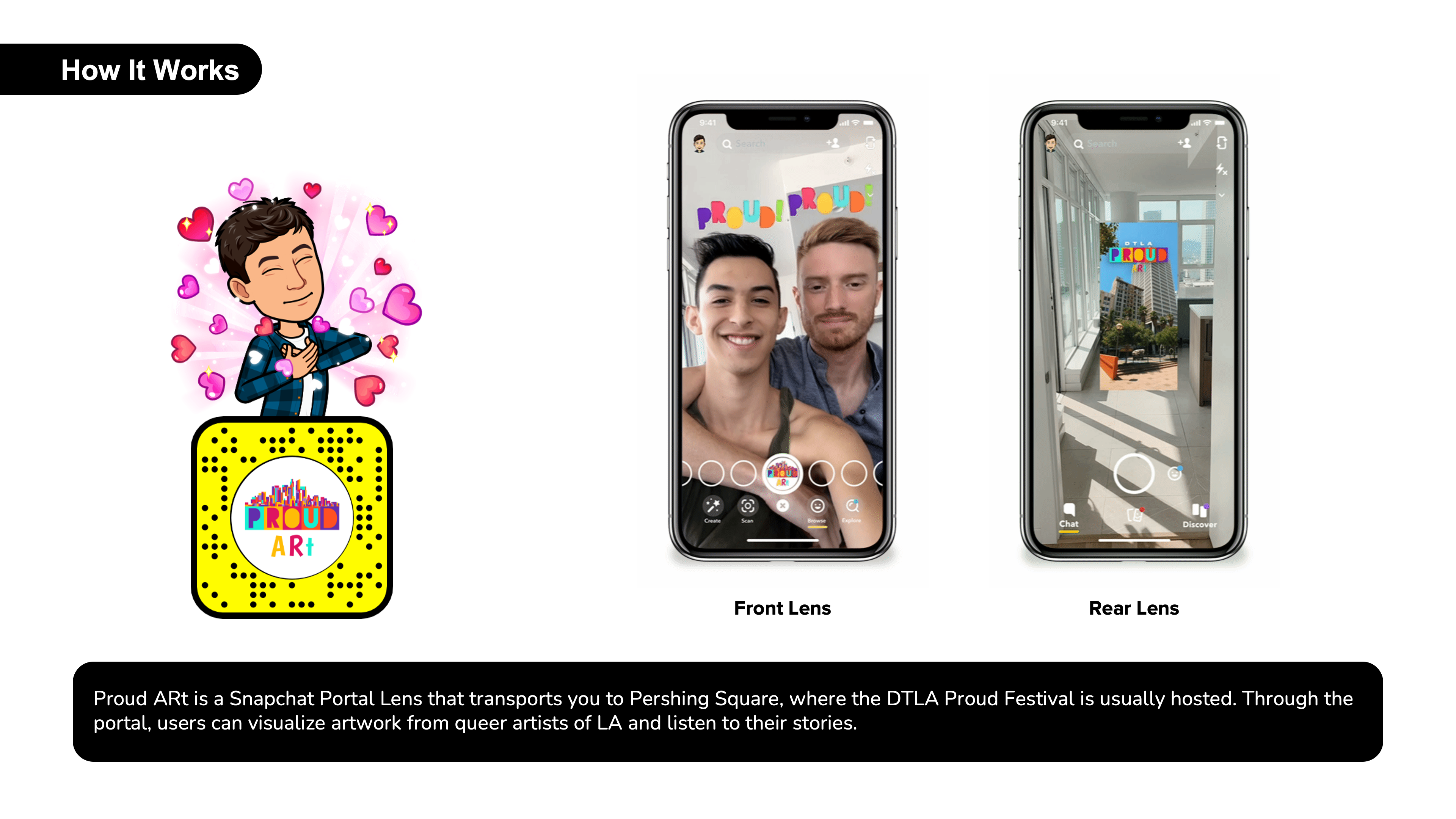 Proud ARt is a Snapchat Portal Lens that transports you to Pershing Square, where the DTLA Proud Festival is usually hosted. Through the portal, users can visualize artwork from queer artists of LA and listen to their stories, donate to the organization, purchase the artwork directly from the Snapchat app and get an exclusive preview of DTLA Proud's upcoming documentary. In addition, users can visualize the AR artwork in their homes and use the front camera to take selfies with the PROUD! filter.