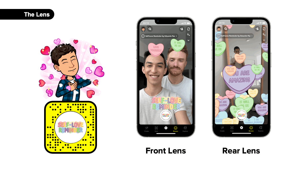I was inspired by randomizer lenses. I thought the front lens could give Snapchat users a random daily self-love reminder. The interaction that triggers the randomizer to stop is opening your mouth, and to restart the randomizer, a tap on the screen. I wanted to translate the concept to the rear camera. So I used the particles object to show the hearts floating in the real world, spaced in 3 dimensions. When Snapchat users walk around them, they can feel surrounded by care, love, and positivity and share their love and appreciation with someone else when recording others.