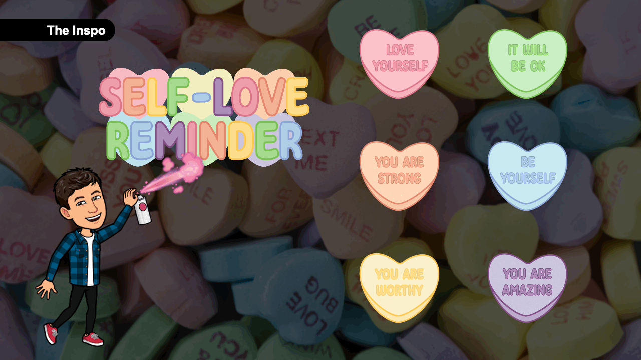 The hearts are meant to be "Sweethearts" or "Conversation Hearts," which are small heart-shaped sugar candies sold around Valentine's Day. Each heart is usually printed with cute and funny messages such as "Be Mine," "Kiss Me," "Miss You" and others. For this concept, I changed the candies to be self-love reminders like: