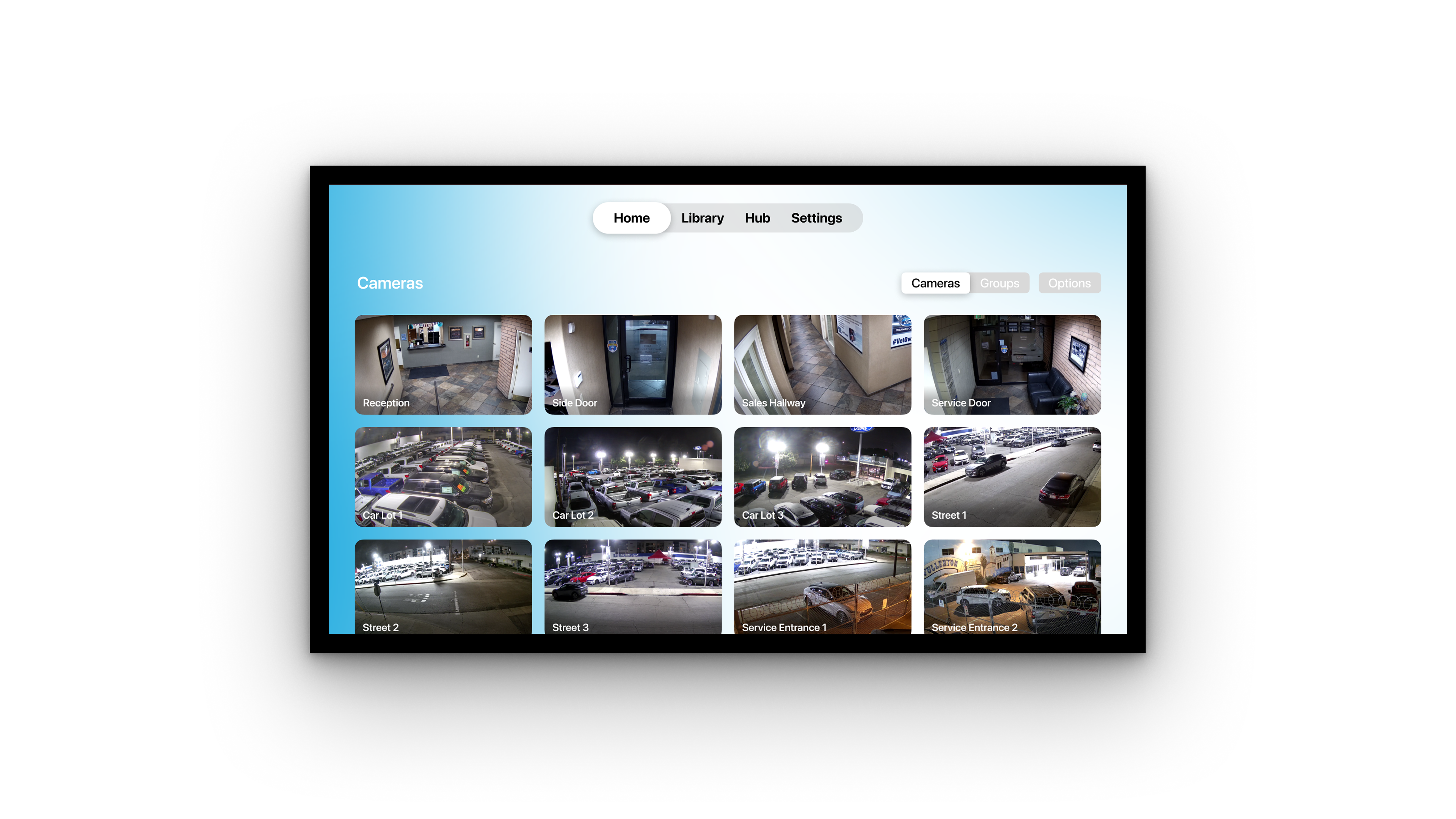 The Home tab can serve as a dedicated space for viewing current cameras, groups, and even modules. The mockup illustrates an account with existing cameras, but new users could be simply redirected to the options button to manually add their cameras.